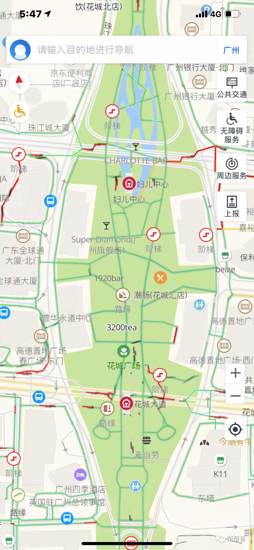 《(图片为App截图,可以查看到广州“珠江新城”片区道路情况及无障碍设施情况)