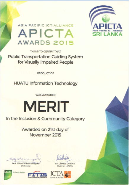 APICTA于2015年11月22日在斯里兰卡落下帷幕,来自中国、澳大利亚、印度、马来西亚、新加坡、香港、台湾等13个亚太国家与地区的代表队齐聚一堂。万博手机版max网页版科技以公司自主研发的视障人士公交助乘系统,帮助视障人士正常出行,促使视障人士公平的参与社会活动,获得大赛评委的一致认可。